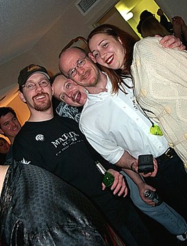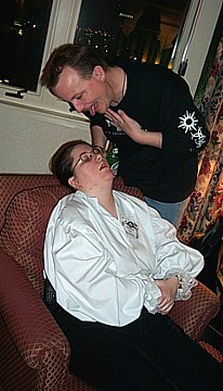 ![]() WHILE ADRIANNE LAY SLEEPING James Newman entertained his fan club. Con attendee Adrianne McClintock, meanwhile, decided to go to sleep at a HORROR PARTY! While one should always feel safe in slumber in their own room, one should NEVER go to sleep at a party. All SORTS of rotten things can happen at a party, ESPECIALLY a HORROR party. |