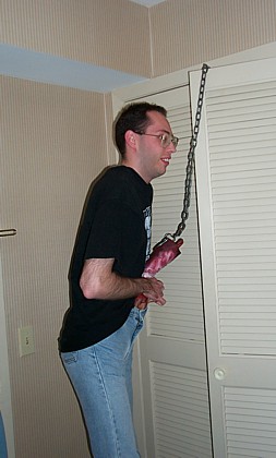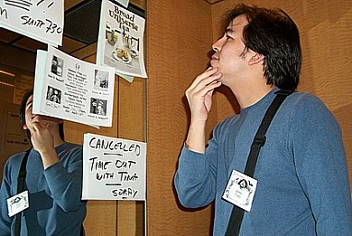 Sean and I finally arrived at 3:00am on the second day of the convention. Few people were up and about at that time, so we seized the moment to run around the hotel plastering feoamante.com and horrorfind.com business cards all over the freaking place! |